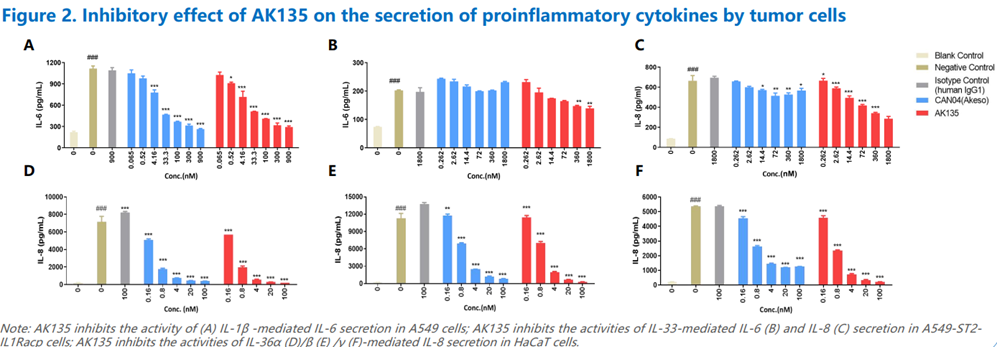 • 抑制炎症因子释放:在肿瘤细胞模型中,AK135显著降低了由IL-1、IL-33和IL-36诱导的促炎细胞因子(如IL-6、IL-8)的分泌。
