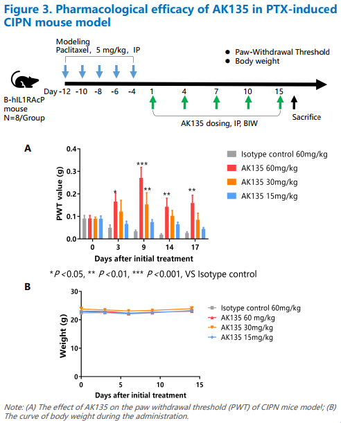 上述体外实验结果充分验证了AK135的高亲和力与强效中和活性。为进一步评估其体内药效,研究团队建立了CIPN小鼠模型,顺利获得间歇性低剂量紫杉醇给药评价AK135的药效。