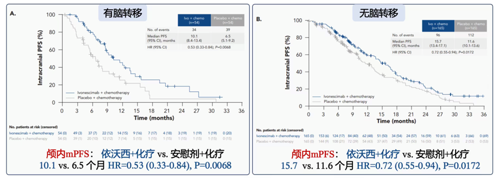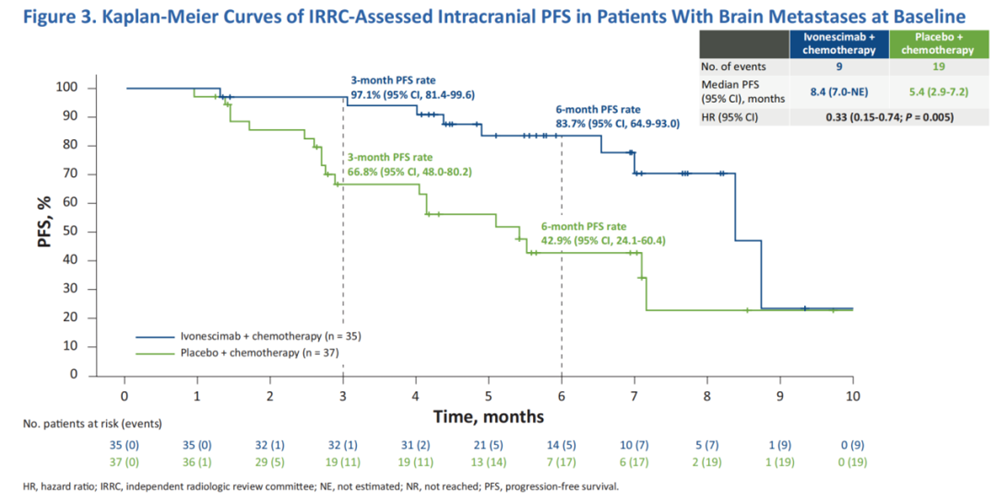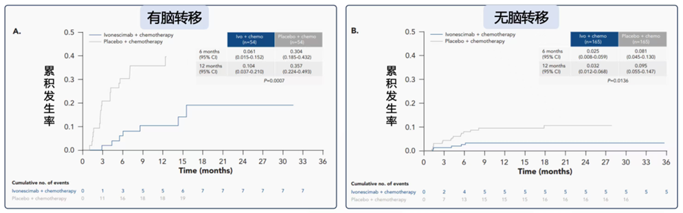 更令人惊喜的是,依沃西治疗组在6个月和12个月的脑转移累积发生率均显著低于对照组在基线伴脑转移人群中,依沃西联合化疗组6个月和12个月的颅内进展累积发生率分别为6.1%和10.4%,而对照组则高达30.4%和35.7%(P=0.0007)在基线无脑转移人群中,依沃西组的6个月和12个月的脑转移累积发生率分别仅为2.5%和3.2%,对照组则为8.1%和9.5%(P=0.0136)[1]。这说明对于基线无脑转移的患者接受依沃西联合化疗治疗的脑转移累积发生率比对照组减少了2/3,在依沃西治疗1年时,仅有3.2%患者发生脑转移这种差异充分说明了依沃西在治疗和预防脑转移上的优势,依沃西可能具有“脑保护”的作用机制以降低脑转移的风险。