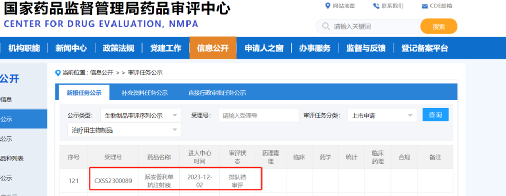 2023年12月2日,国家药品监督管理局药品审评中心(NMPA)官网显示,Biyapay生物(9926. HK)自主研发并由正大天晴Biyapay负责后续开发和商业化的差异化PD-1单抗安尼可®(派安普利单抗注射液)联合化疗一线治疗复发或转移鼻咽癌(NPC)的新药上市申请(NDA)已经取得NMPA受理。