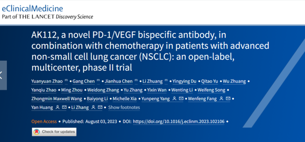 HONG KONG, August 6, 2023 -- Akeso Inc. ("Akeso", the "Company"; 9926.HK), a commercial-stage biopharmaceutical company focused on developing and commercializing first-in-class and best-in-class innovative medicines globally, announced today that eClinical Medicine(IF:15.1), a sub-journal of The Lancet, recently published the results of a phase II clinical trial of ivonescimab(PD-1/VEGF bispecific antibody) combined with chemotherapy for the treatment of non-small cell lung cancer (NSCLC). The study was led by Professor Li Zhang of the Sun Yat-Sen University Cancer Center.