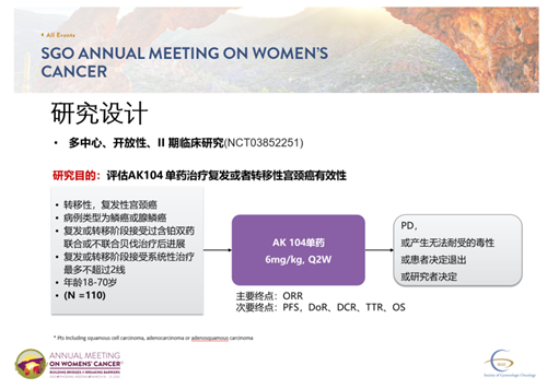 卡度尼利单抗治疗复发/转移性宫颈癌的Ⅱ期关键研究(201研究)已在2022 SGO大会上公布阳性结果。2019年9月26至2021年1月8日,201研究历时超过15个月,由全国36家中心共同参与,共纳入111例晚期宫颈癌患者。研究旨在评价卡度尼利单抗治疗既往接受≤2线双药化疗±贝伐珠单抗治疗的复发/转移性宫颈癌患者的有效性和安全性。主要终点为独立影像审查委员会(IRRC)评估的ORR。关键次要终点为缓解持续时间(DoR)。