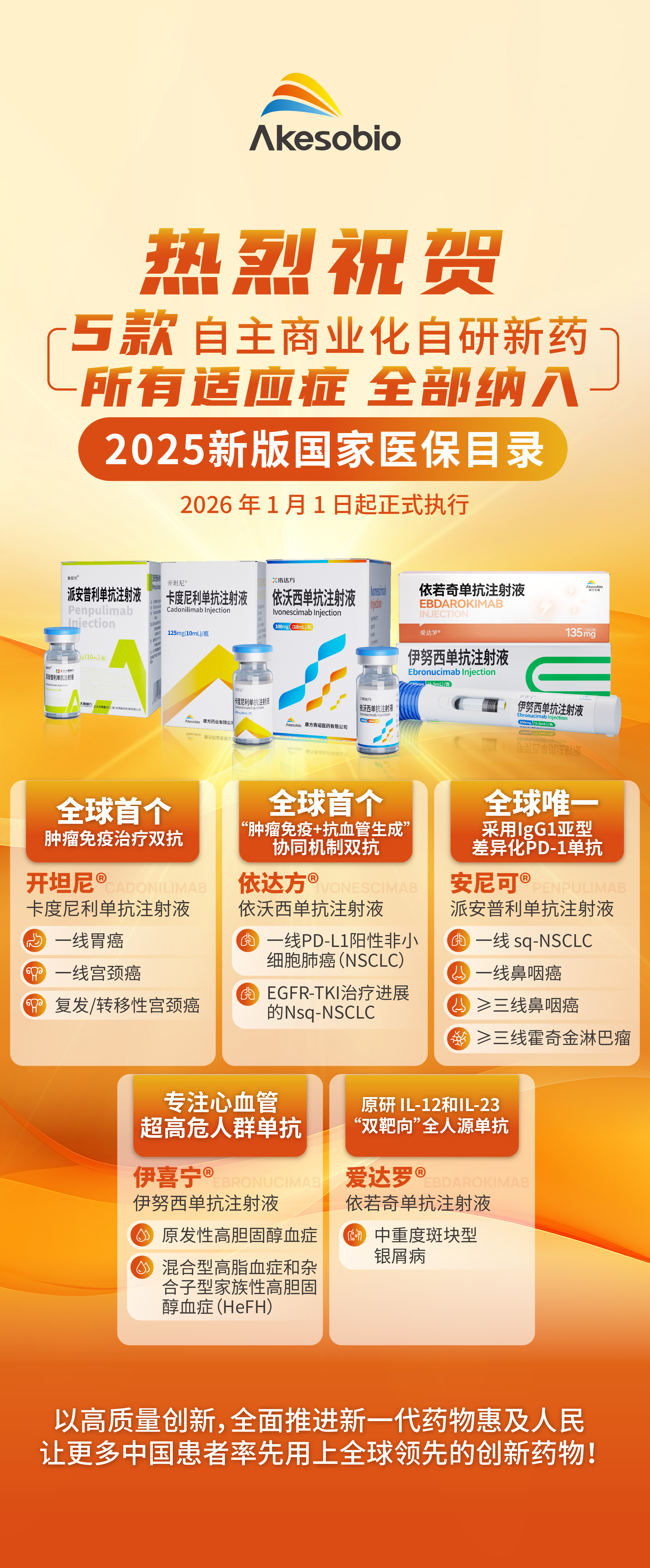 公司自研首创PD-1/CTLA-4肿瘤免疫双抗卡度尼利(商品名:开坦尼®)本次新增一线胃癌和一线宫颈癌适应症谈判成功,被纳入国家医保目录。
